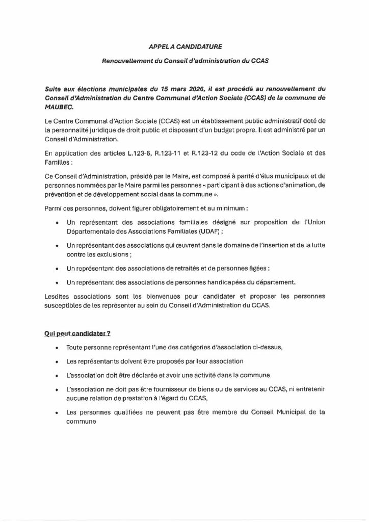 Suite aux élections municipales du 15 mars 2026, il est procédé au renouvellement du Conseil d’Administration du Centre Communal d’Action Sociale (CCAS) de la commune de Maubec. Le lien ci-dessous vous permettra de consulter l’appel à candidature:Appel à candidature