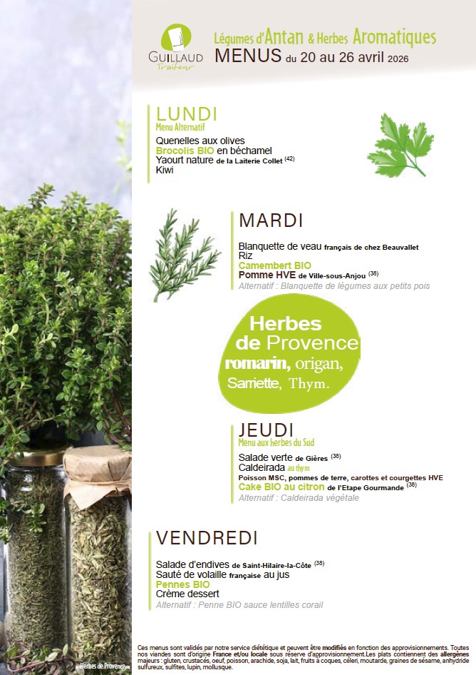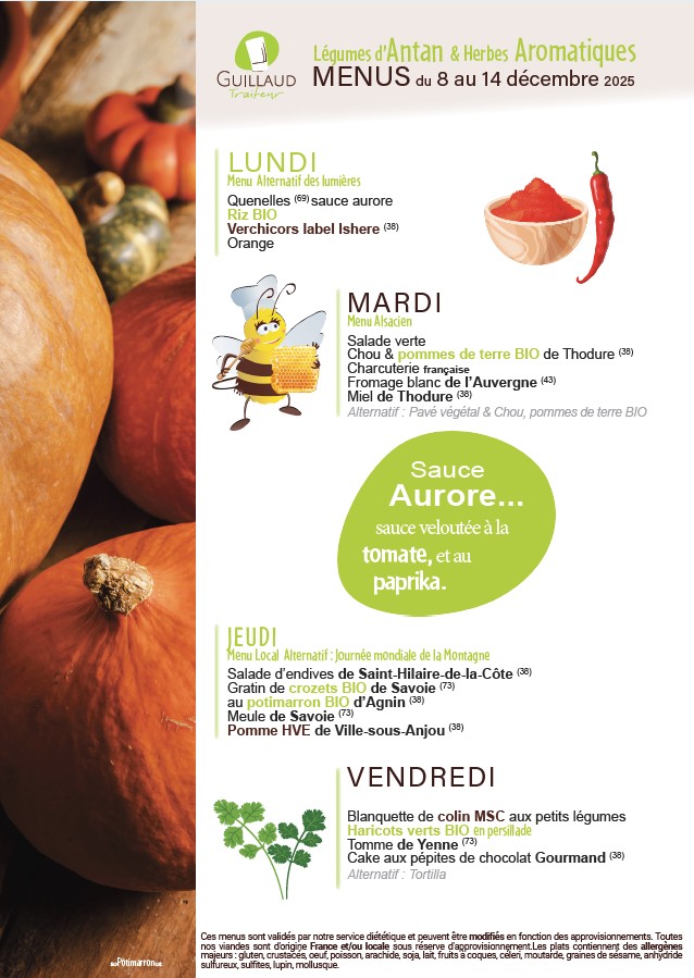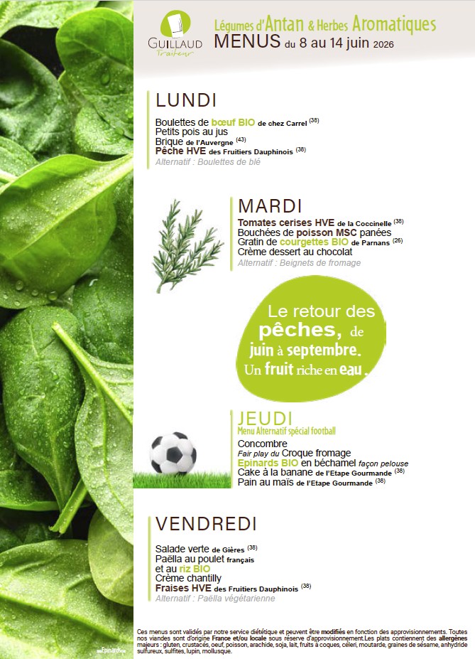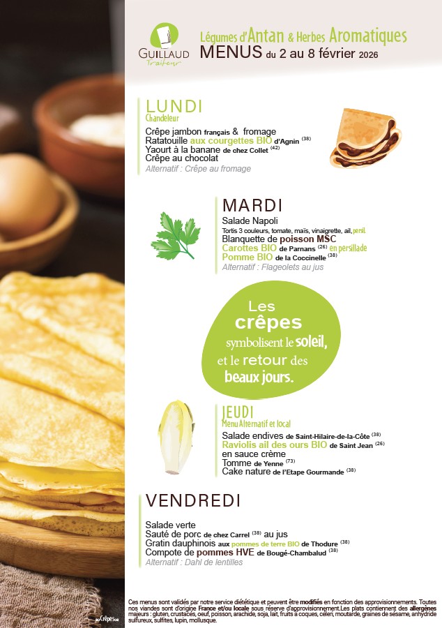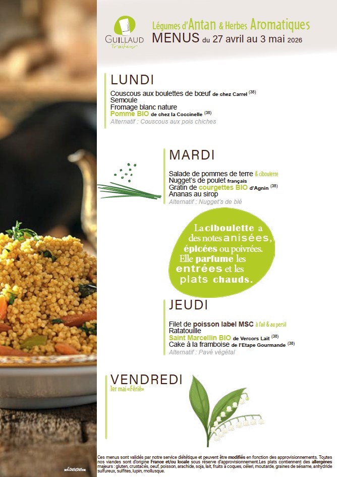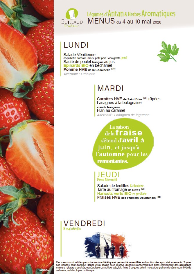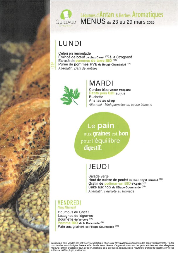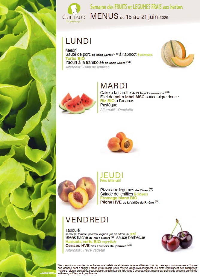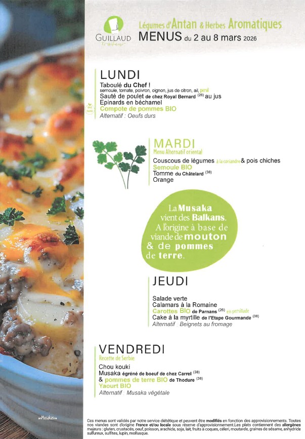 La fourniture des repas de notre restaurant scolaire est confiée à la Société GUILLAUD Traiteur.
