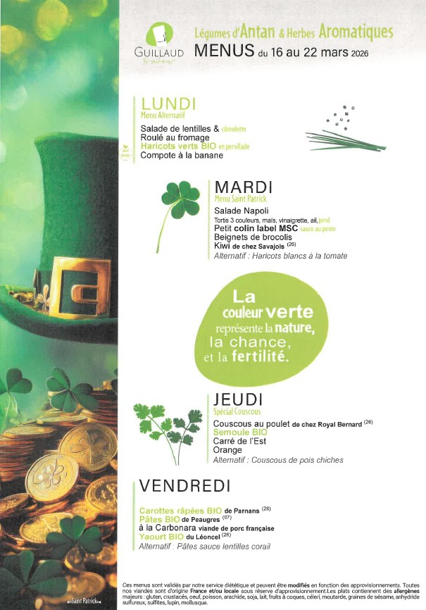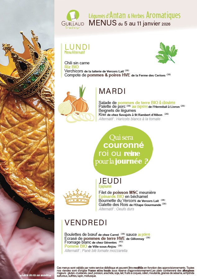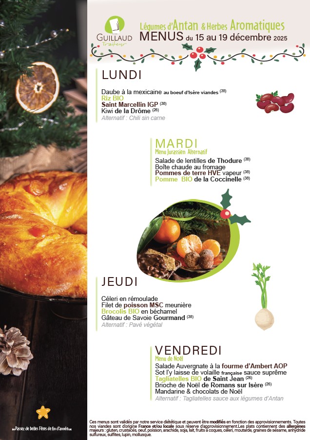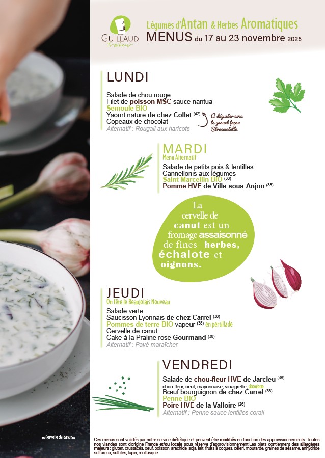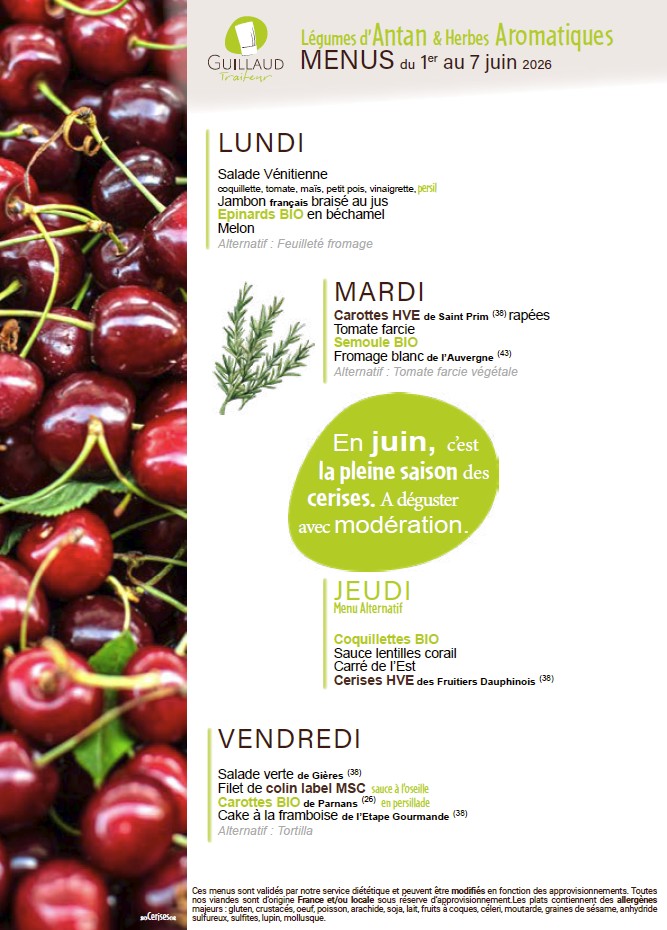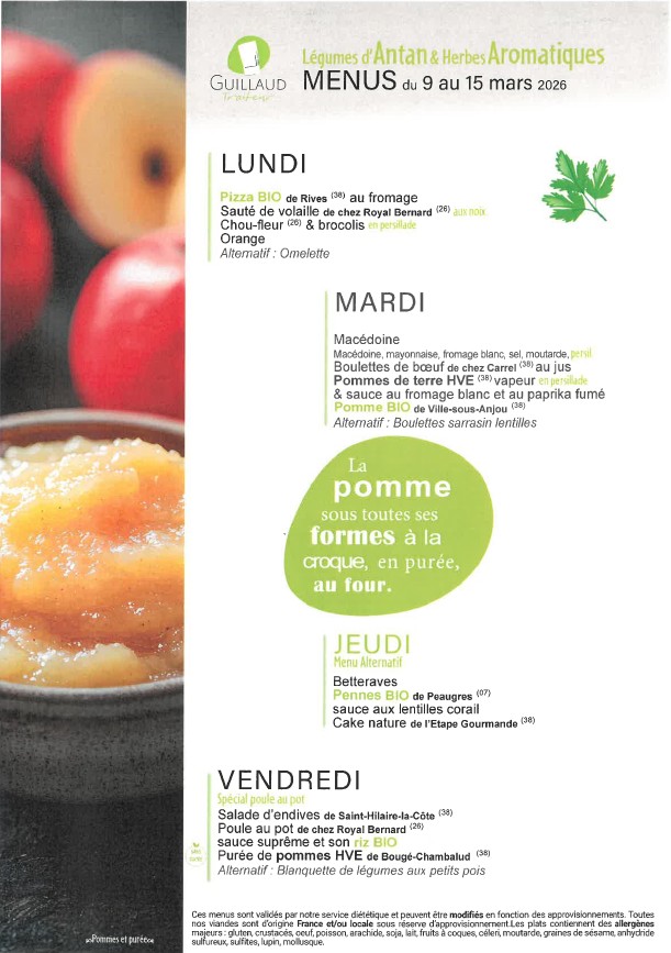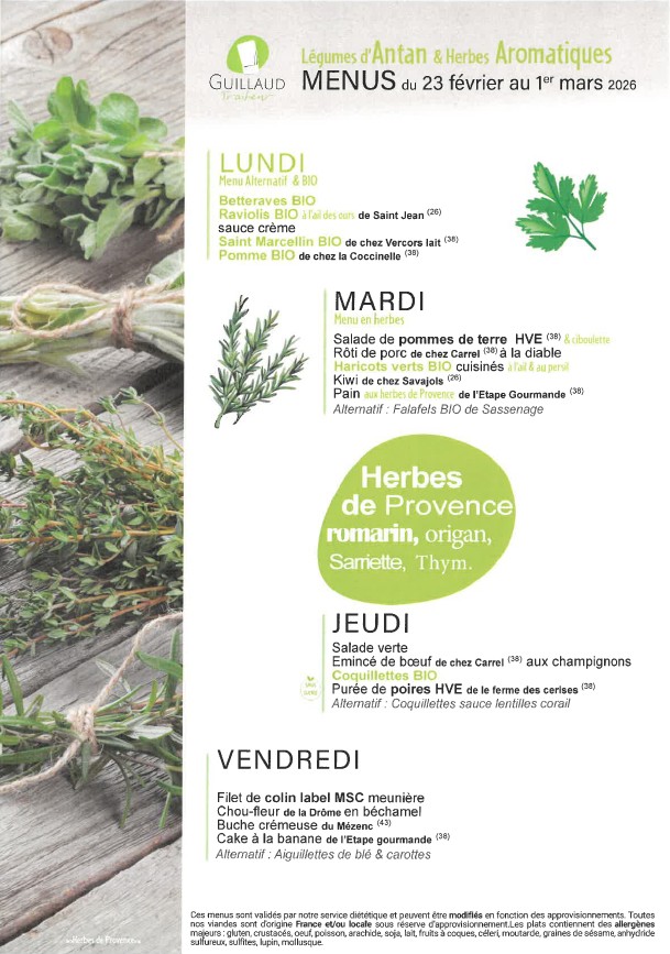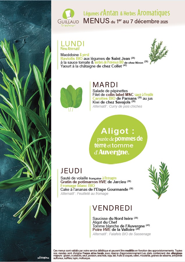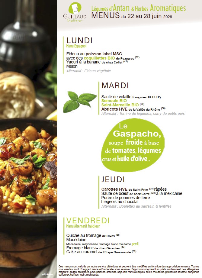 La fourniture des repas de notre restaurant scolaire est confiée à la Société GUILLAUD Traiteur.
